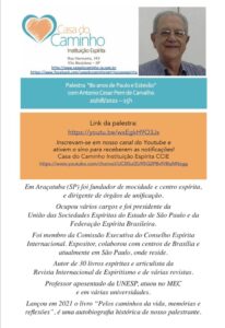 A Casa do Caminho convida a todos para a palestra Palestra “80 anos de Paulo Estevão” com Antonio Cesar Perri de Carvalho, a ser realizada no dia 20/08/2022, às 15h, em nosso canal do youtube – https://youtu.be/wxEgkH9O3Js